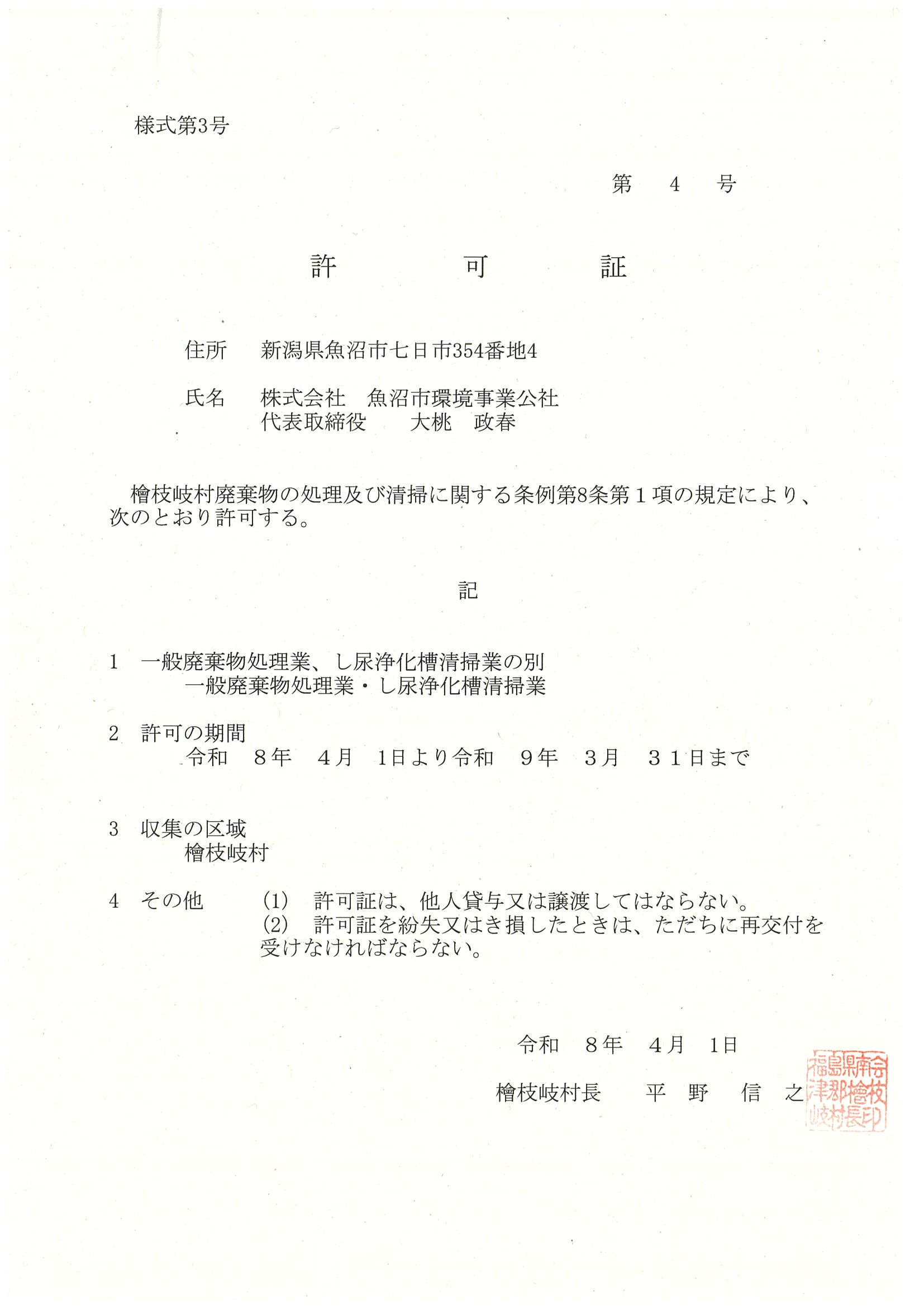 桧枝岐村 一般廃棄物・し尿浄化槽清掃業許可証